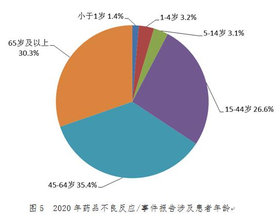 2020年全国药品不良反应监测网络中65岁及以上老年患者相关报告占30.3%,较2019年略有升高。2020年共收到老年患者严重报告占老年患者报告总数的11.5%,高于2020年总体报告中严重报告比例。