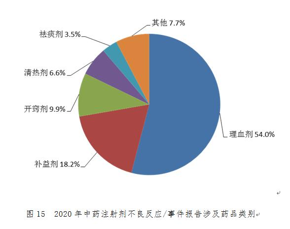 2020年药品不良反应/事件报告涉及的中药中,例次数排名前5位的类别分别是理血剂中活血化瘀药(25.8%)、清热剂中清热解毒药(11.9%)、祛湿剂中清热除湿药(6.5%)、补益剂中益气养阴药(5.7%)、祛湿剂中祛风胜湿药(4.6%)。2020年中药严重不良反应/事件报告的例次数排名前5位的类别分别是理血剂中活血化瘀药(41.2%)、补益剂中益气养阴药(12.7%)、开窍剂中凉开药(7.9%)、清热剂中清热解毒药(7.3%)、祛湿剂中清热除湿药(3.0%)。
